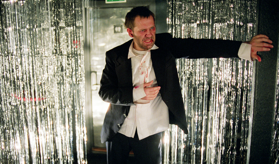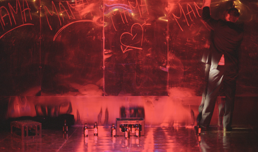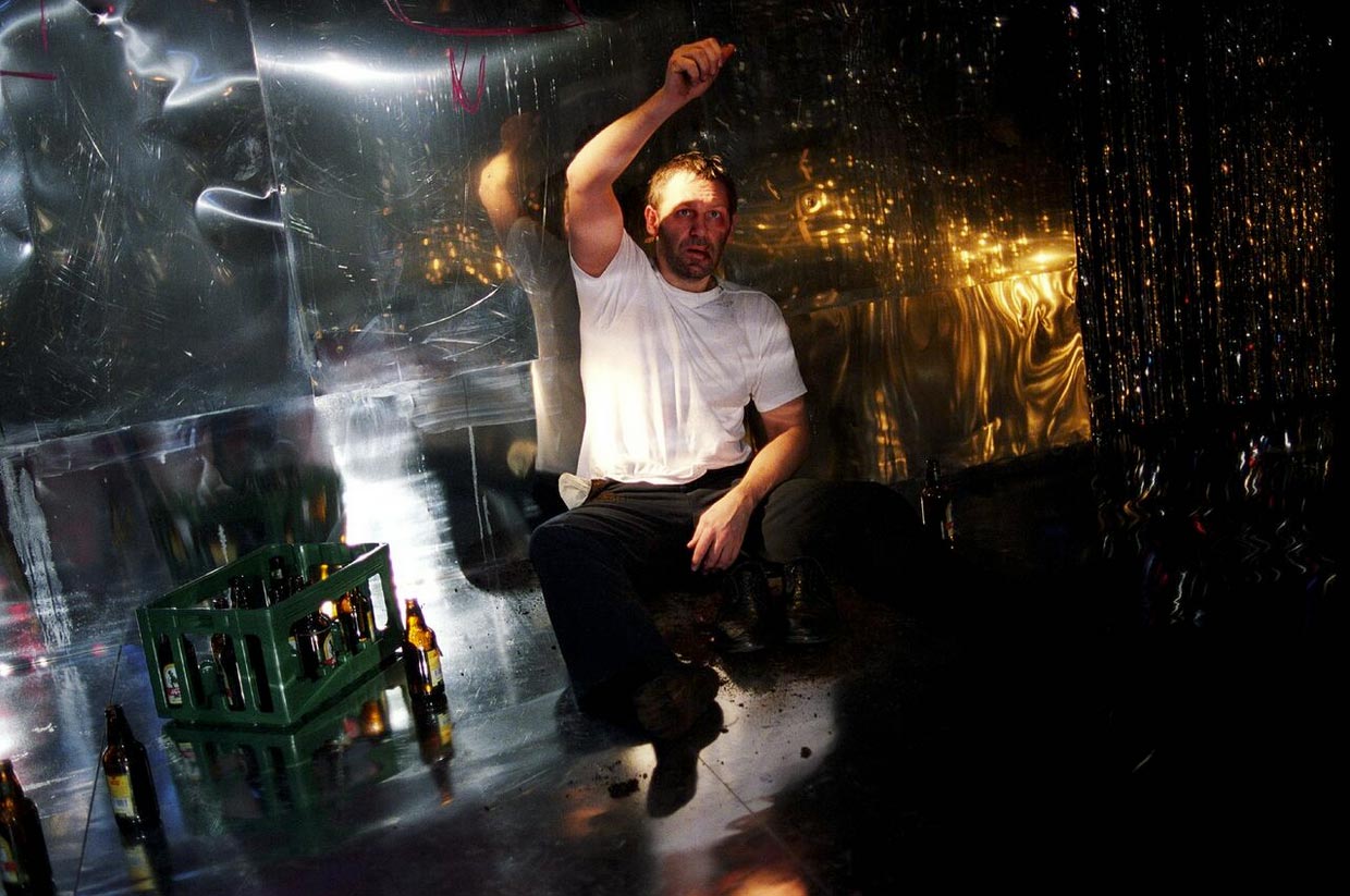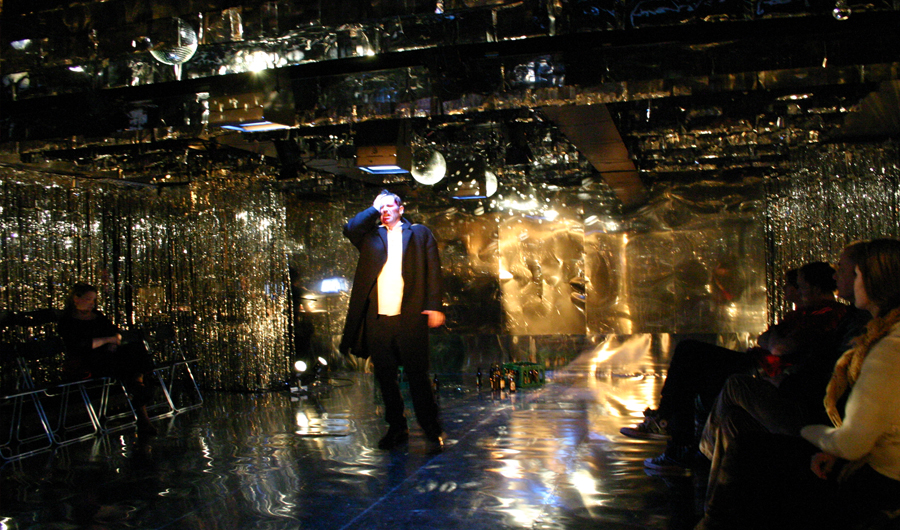‘De nacht voor de bossen’ was een intieme voorstelling met één acteur. Ik creëerde een nachtclub, een zilveren ruimte die door de belichting ijskoud of benauwd en intiem kon worden. Rondom het publiek was een gang van zilverglitter gordijn, waar de acteur doorheen rende. De toeschouwers zaten met drankjes binnen handbereik rondom de stalen dansvloer, waardoor de acteur ze dicht op de huid kon zitten.