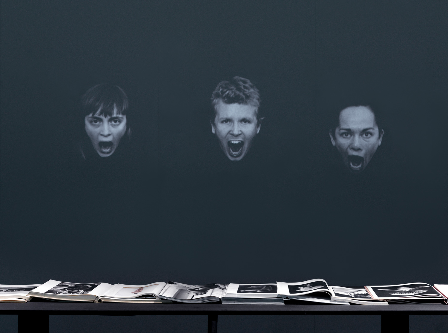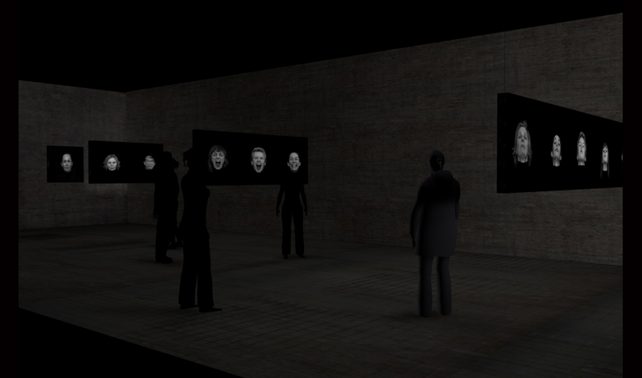 On the second screen you see three younger people; very slowly, the corners of their mouths turn up, creating a subtle smile. Then, a guffaw. The roar of laughter slowly transforms from a beastly expression to a silent, terrifying scream. The faces then relax and recover – or so it seems. For in that moment, the scene repeats itself.