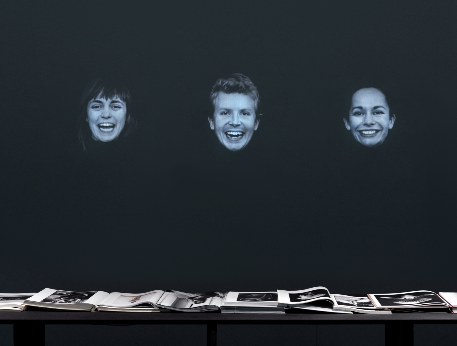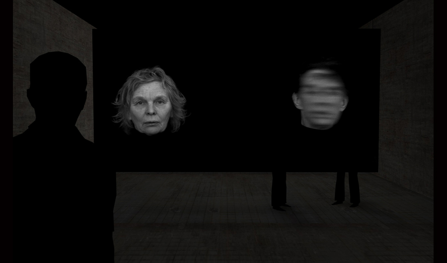 Five Faces is a video choreography in four parts, projected on four black projection screens, hanging at eye level. The spectator can move freely between the screens and see the projection on both sides of the screen. Five, three, two and one faces can be seen in succession.