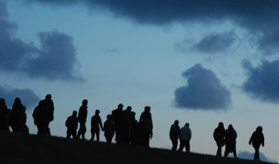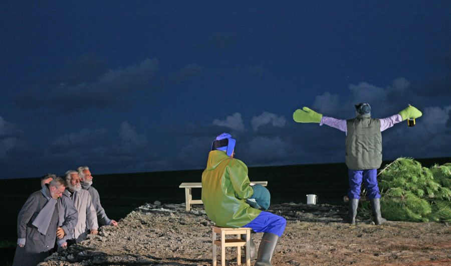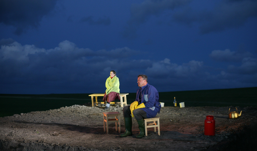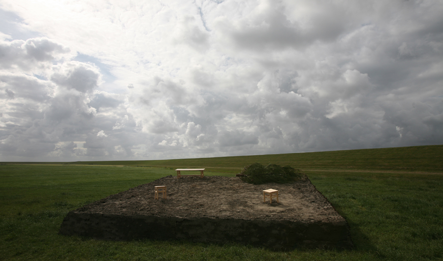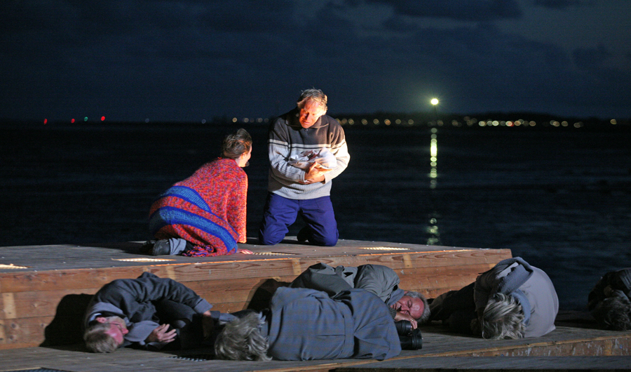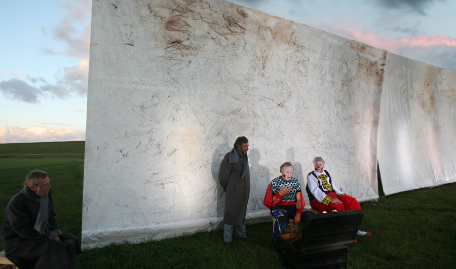 Op de vierkante plag ploetert de boerenfamilie in de aarde. Het publiek loopt de dijk over naar zee, waar het slot gespeeld wordt op een vlot. De dijk is tribune, het publiek kijkt richting zee, waar de personages tot inzicht komen.