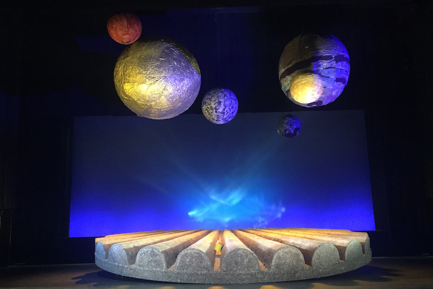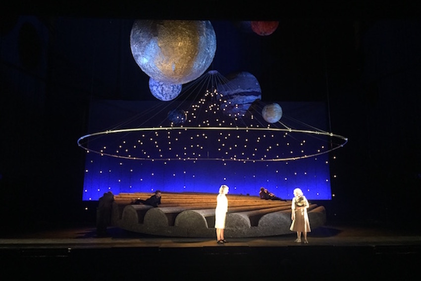 In de hal die ooit onderdak bood aan sfeervolle interieurs liggen de vilten bollen te wachten tot ze worden opgehangen, een gouden zon, de witte maan, een hele donkere planeet, en zo nog een aantal, prachtig intens van kleur. ‘De constructie is die van een groot mobiel, technisch echt een klus, hij beweegt namelijk en boven het publiek hangen er ook drie. Zo zijn we allen deel van hetzelfde stelsel, in Nederland, Friesland, in het theater, een familie – het toneelbeeld verschuift parallel aan het verhaal van groot en alles omvattend, naar klein en weer terug. Ik vind dit echt het mooiste dat Ira hier gemaakt heeft.’
