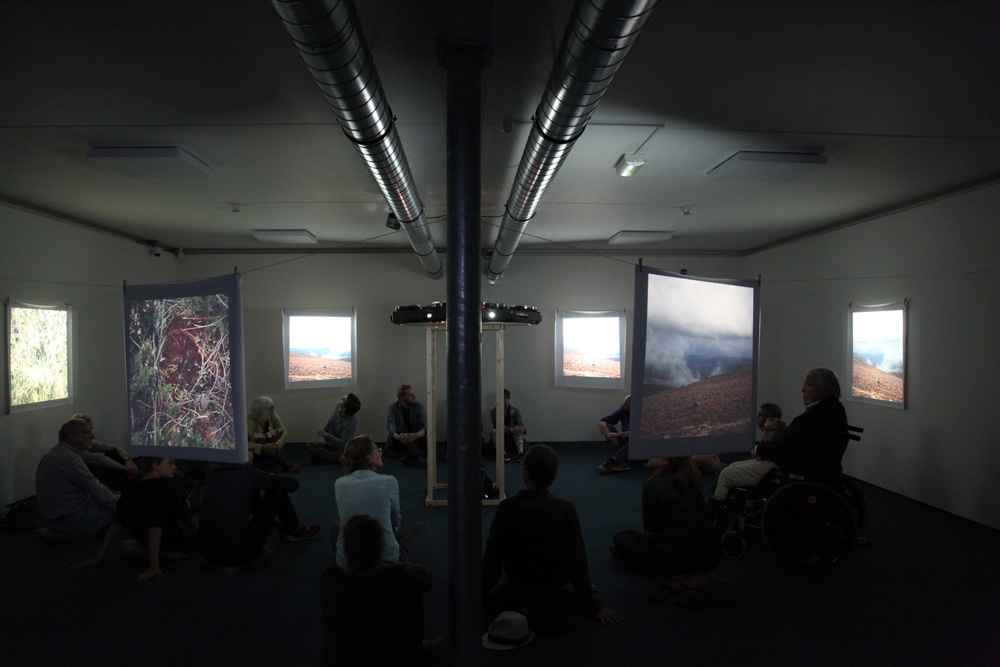 The Higgs Particle is a lecture performance in which the audience is placed inside an “analog particle accelerator” — a space where slides appear and disappear all around them. Roos van Geffen walks in circles among the spectators, weaving together the scientific quest for the Higgs particle with personal stories and philosophical questions. During and after her storytelling, projections of fleeting circles emerge and dissolve around the audience, echoing the way particles appear and decay inside CERN’s particle accelerator.