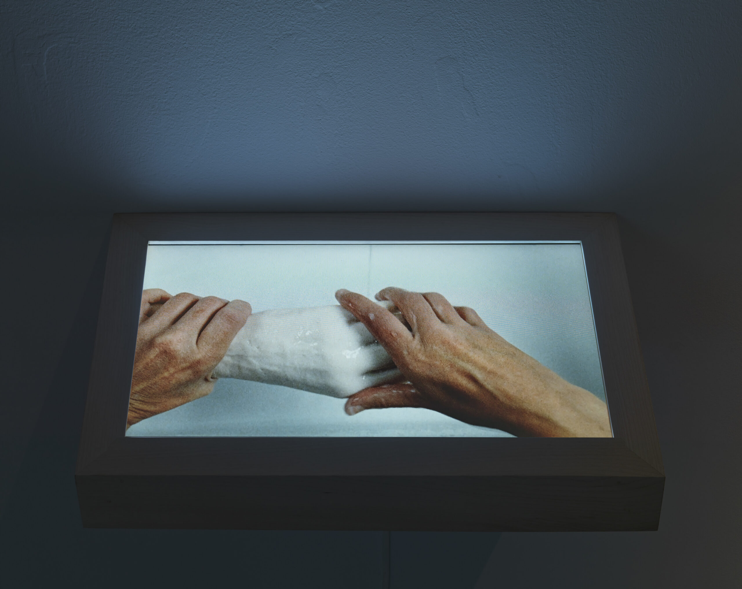 This diptych consists of a film and a soap hand. The hand belongs to the artist’s mother, made of soap, smelling of myrrh. Myrrh is a bitter gum resin that refers in the Bible to the suffering of Christ. On the film you see how two hands wash themselves with this hand of soap. The artist washed with it daily and filmed the different stages of deformation. You see that the soap hand is becoming smoother and more vulnerable. Ultimately, the ends of the fingers are very thin; a finger even breaks off.