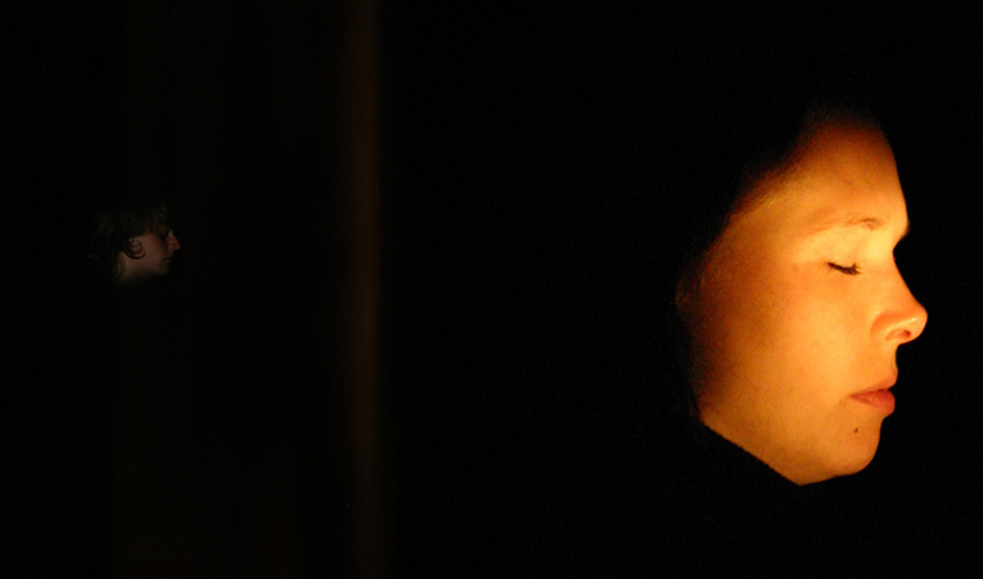 When the spectator arrives at the location, he sees a round wooden construction with all doors. Around the construction is a circle of 16 chairs, one chair for each door. Every ten minutes one perso can enther the wooden construction.He is assigned a chair. He is asked if he is not afraid of the dark, nor claustrophobic and if his phone is turned off. Then he can enter into one cabin. The chair on which he sits is adjusted to the correct height so that he can see his own eyes in a rectangular glass beam. The bar moves very slowly to the left. In front of him is a black window, without glass. The door closes, the lights go out slowly. It is pitch dark. Something can be seen in the distance. Unrecognizable at first. Slowly a face and profile become visible. Then a face appears on the right, also and in profile, closer. The two faces (both with closed eyes), separated by a thin line, are visible at the same time, until the second face is completely pushed in front of the viewer. Only the face is visible, then a black surface slides in front of the viewer, so that his window is completely covered. A face emerges from the pitch dark, it comes closer and closer, until it is directly in front of you, precisely then the performer opens her eyes. She looks, without seeing, smiles. When she walks back again, the next space becomes visible. The spectator sees how a woman also walks backwards. When the entire room is visible, the woman looks directly at him. Her face is brightly lit, as if light is coming through a window.