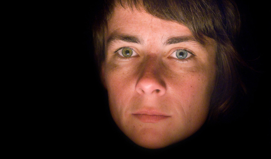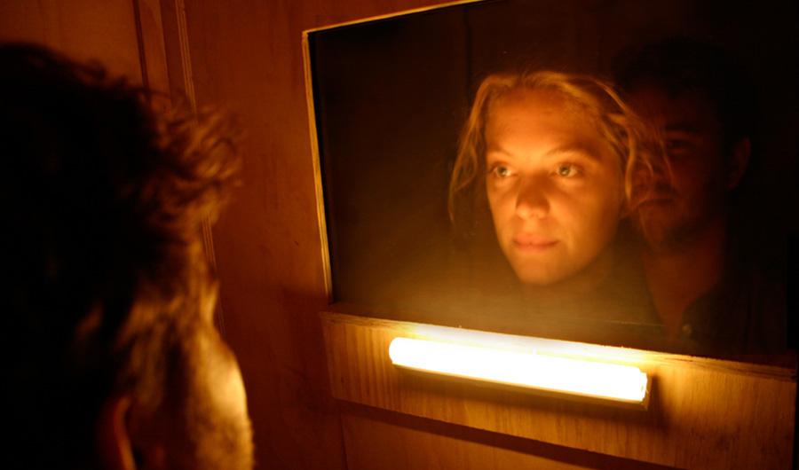 When she is almost out of the viewer’s left she asks her last question: “I don’t know who you are”. The spectator sits for a while when a glass plate is placed in front of his window. He sees himself. After looking at himself for a moment, he sees another pair of eyes appear behind his eyes. His face slowly merges with the performer’s face in the distance, until it is fully visible and directly in front of the viewer. The spectator and the performer look straight at each other for about 3 minuts. After a while, the performer slowly turns off the light and removes the glass plate. The spectator is alone in the black space. The elongated bar appears to the right of the window and the light turns on slowly.